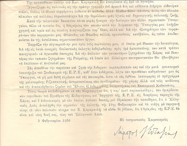 Προεκλογική επιστολή του Λάμπρου Ευταξία το 1956, από τον Φιλίστωρ Δαδίου Δρυμίας